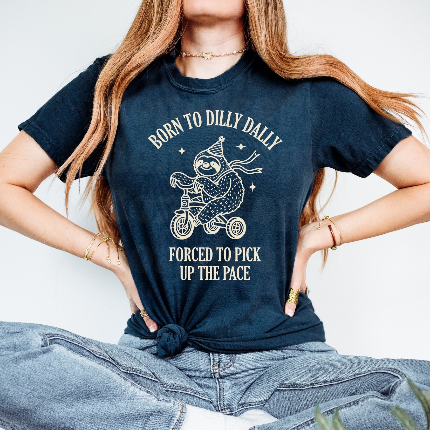 Born to Dilly Dally Graphic Tee This playful tee is made for anyone who'd rather take the scenic route. Featuring a charming sloth zooming along on a bicycle with a flowing scarf, paired with the tongue-in-cheek message "Born to Dilly Dally, Forced to Pick up the Pace," it's a wearable nod to embracing your natural speed. The whimsical artwork captures that perfectly imperfect balance between wanting to slow down and keeping up with the world. Ideal for laid-back vibes with a side of humor—because sometimes moving at sloth-speed is exactly the right pace.
