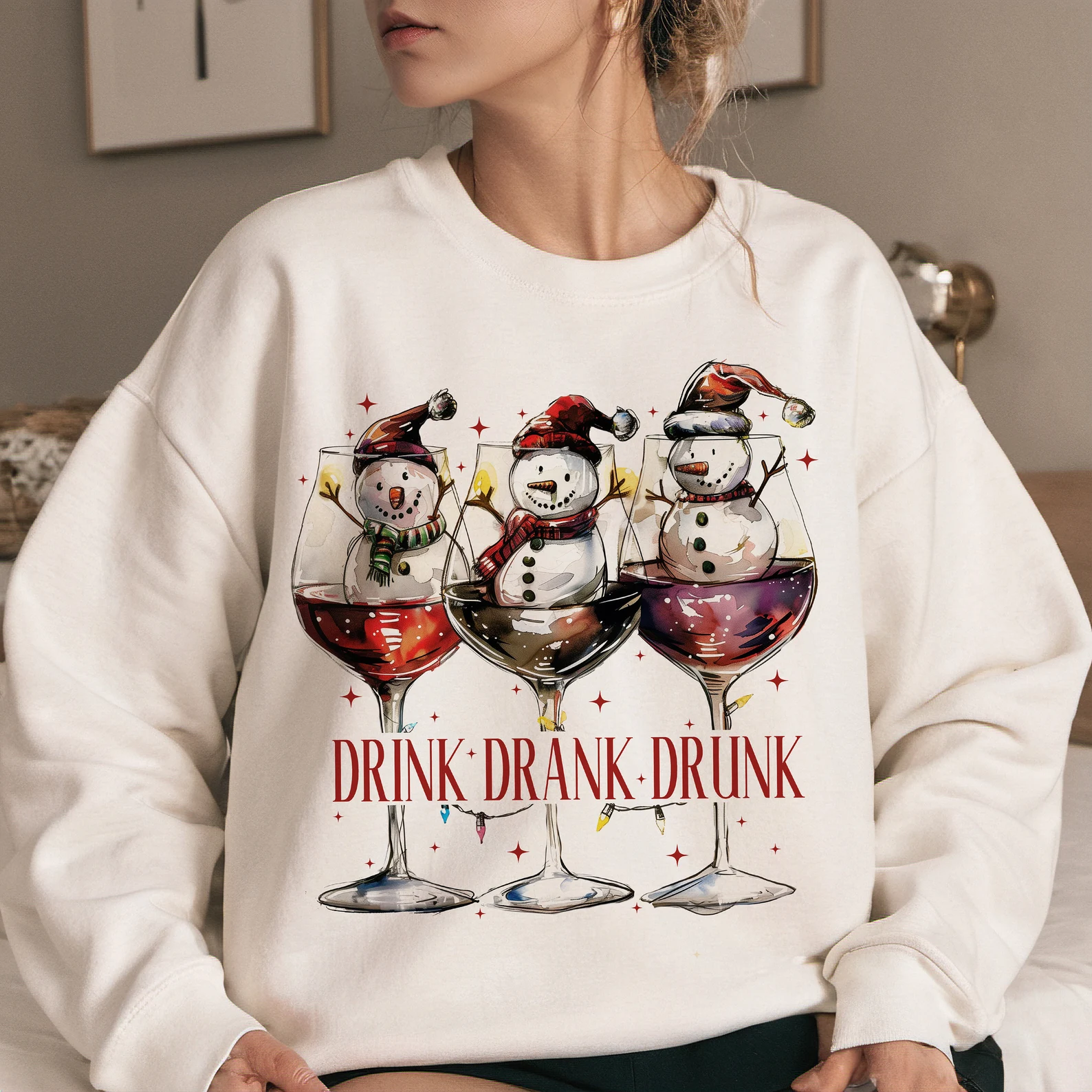 Raise a glass to holiday hilarity with this Drink Drank Drunk Graphic Tee. Featuring three mischievous snowmen melting in oversized wine glasses, this design brings witty winter vibes and a cheeky sense of humor to your seasonal wardrobe. Perfect for ugly sweater parties, holiday gatherings, or anyone who appreciates a good laugh. Soft, comfortable cotton blend keeps you cozy while you spread the festive cheer and good-natured jokes.