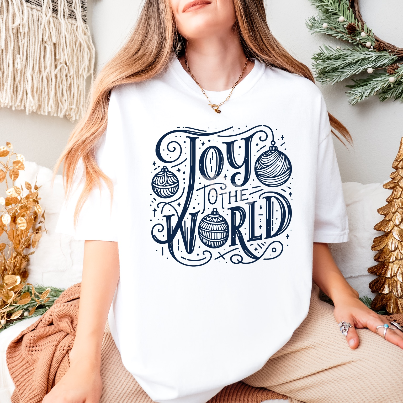 Celebrate the season with the Joy to the World Graphic Tee, featuring a cheerful design printed in navy blue ink. This playful tee brings festive spirit and a joyful vibe to your holiday wardrobe, perfect for spreading happiness all season long.