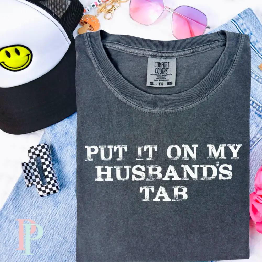 Show off your fun side with the "Put it on my Husband's Tab" Graphic Tee. This playful shirt brings a lighthearted vibe perfect for casual outings or relaxing weekends. Made with soft, comfortable fabric, it’s easy to wear all day while sparking smiles and laughs wherever you go. A great way to keep things cheeky and charming while keeping it simple.