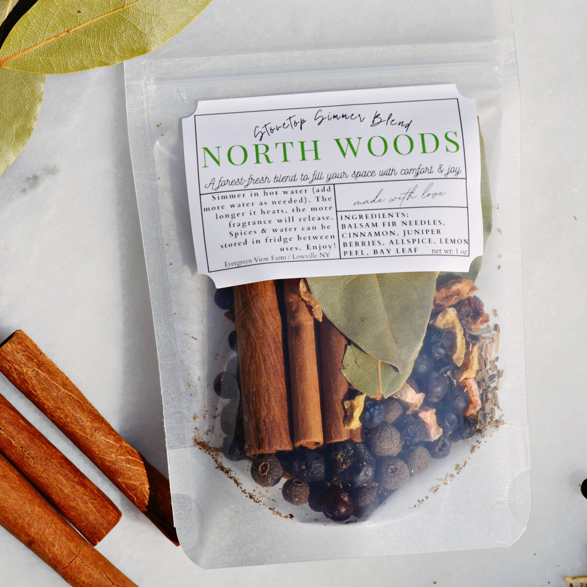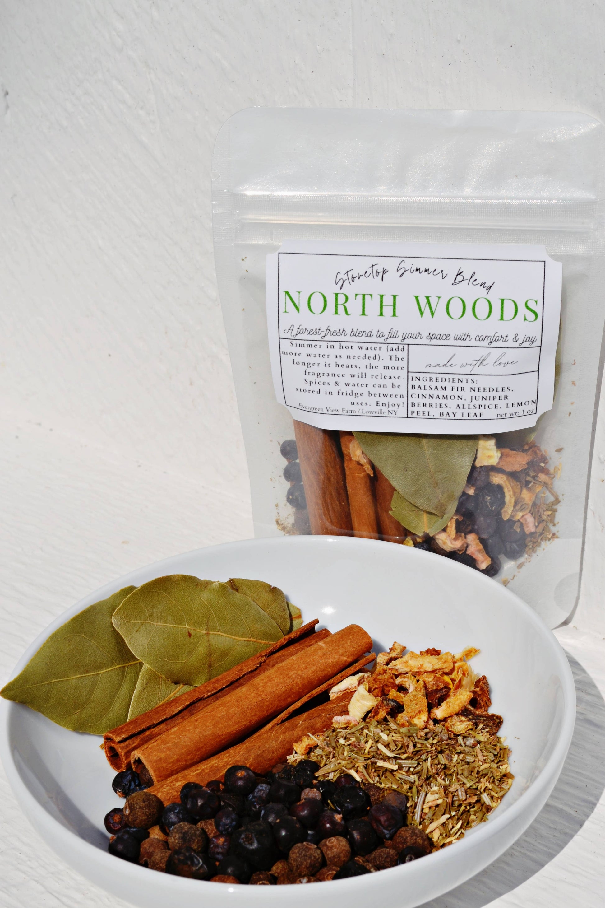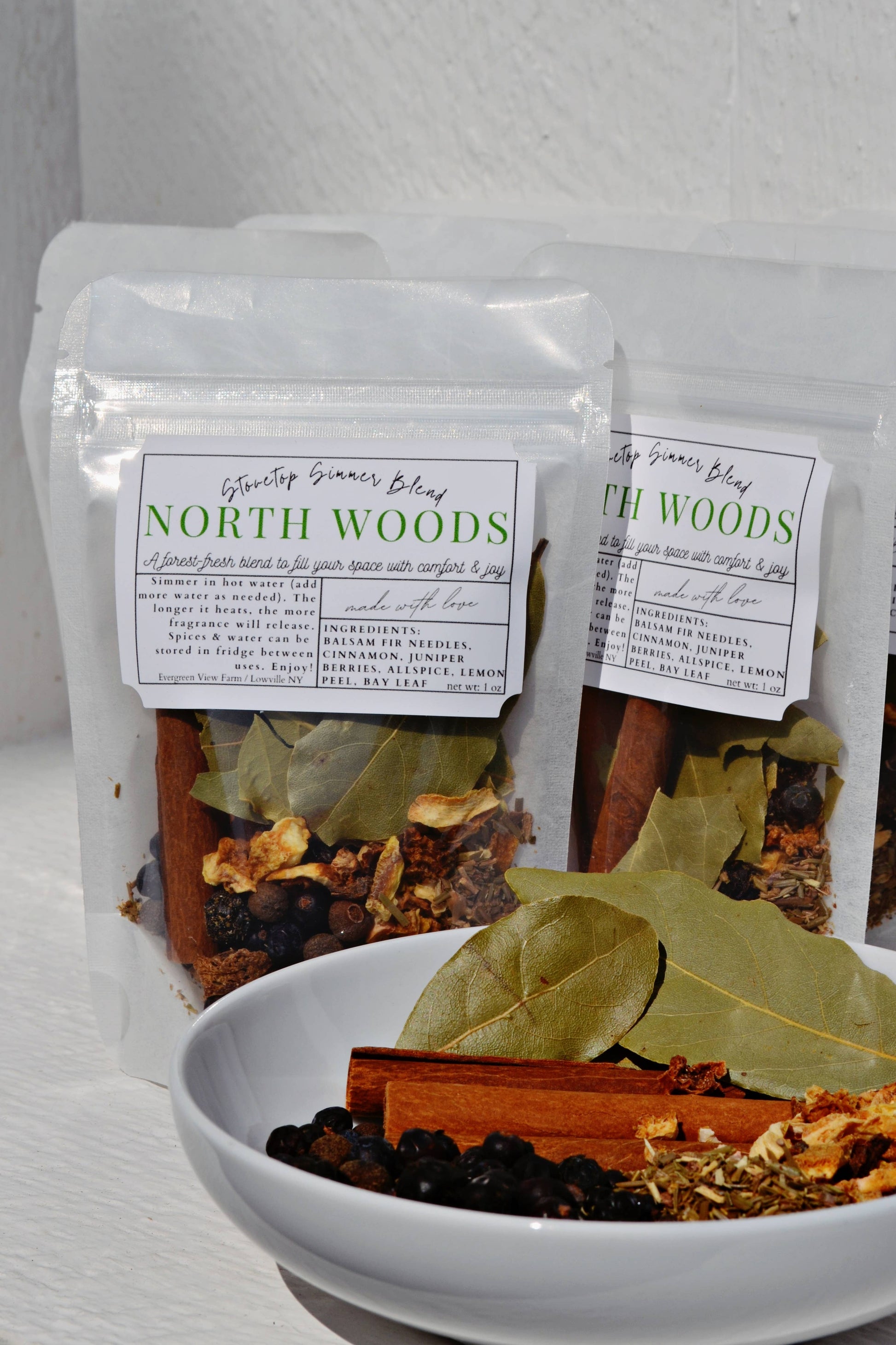 NORTH WOODS blend. Enjoy cozy cheer & comfort. A popular gift item! A Christmas Eve tradition in our home, or enjoy anytime of year. Hostess gifts, favors for bridal & baby showers, stocking stuffers, gifts for Christmas exchanges, coworkers, neighbors, teachers. A popular customer appreciation item for real estate agents and other businesses. *Directions: Add spices to hot water & simmer on stovetop. We use high quality dried spices for a potent blend. While simmering they will release a wonderful fragrance. The spices and water blend can be stored in the refrigerator between uses for multiple simmers. *Per packet: *Per packet: Net weight 1 oz. *Shelf life: 1 year